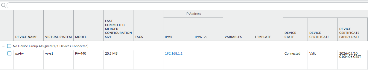 So here we are: my lab FW running 11.1.x and a freshly installed Panorama on 12.1. Everything is in place: